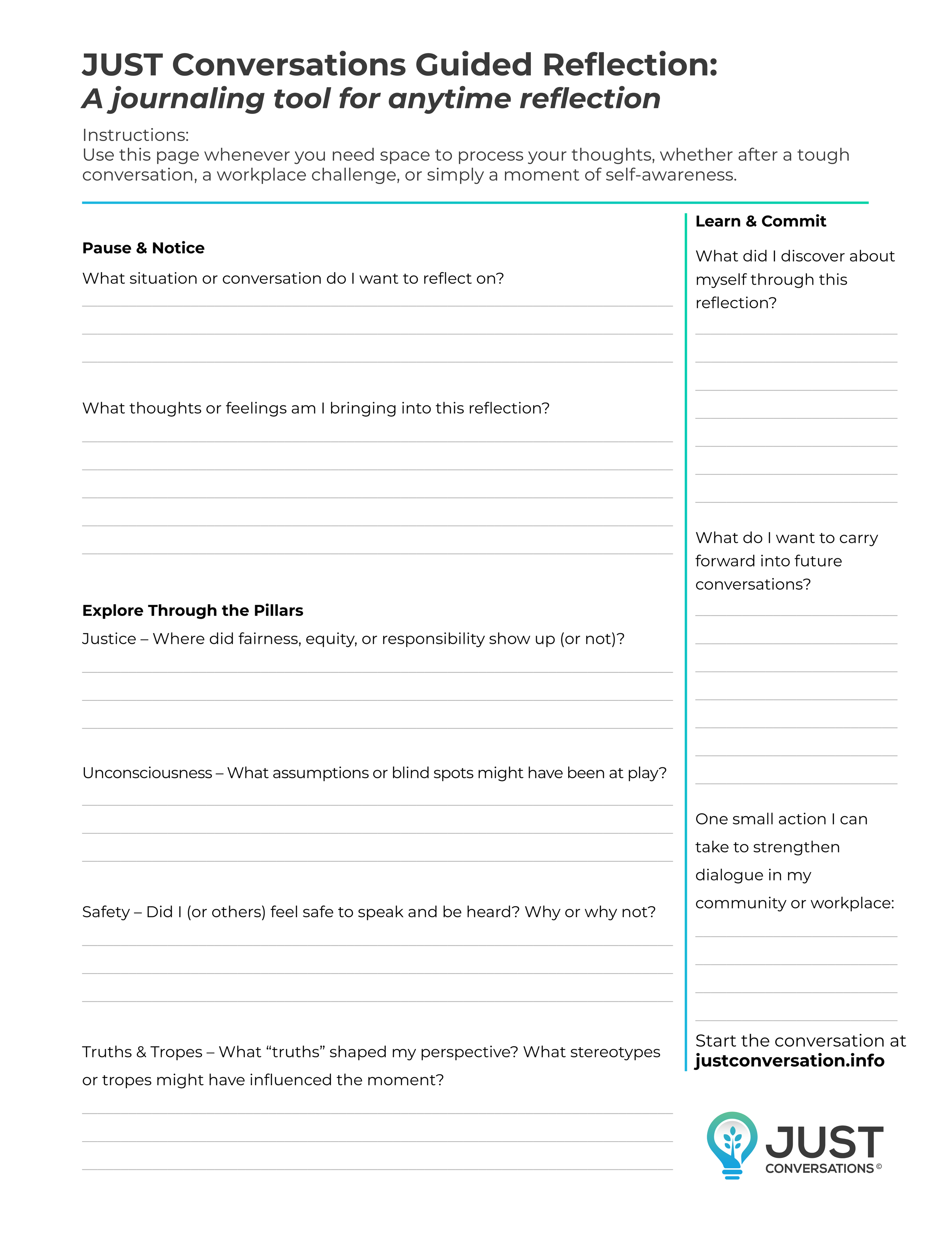 Download a guided reflection page to capture your personal insights, key takeaways, and action commitments as you move through the JUST Conversations program.